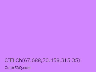 CIELCh 67.688,70.458,315.35 Color is a light purple color and the nearest color is Pale Violet #cc99ff. Hex code #d185ff and RGB value is rgb(209,133,255). In RGB color space, this color is composed of 82% red, 52% green, 100% blue, In CMYK color space, this color is composed of 18% cyan, 48% magenta, 0% yellow , 0% black , In HSL color space, this color has a hue angle of 277° , 100% saturation and 76% lightness.