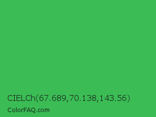 CIELCh 67.689,70.138,143.56 Color is a normal green color and the nearest color is Chateau Green #40a860. Hex code #3bbc55 and RGB value is rgb(59,188,85). In RGB color space, this color is composed of 23% red, 74% green, 33% blue, In CMYK color space, this color is composed of 69% cyan, 0% magenta, 55% yellow , 26% black , In HSL color space, this color has a hue angle of 132° , 52% saturation and 48% lightness.