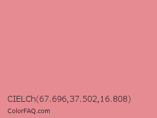 CIELCh 67.696,37.502,16.808 Color is a light red color and the nearest color is Ruddy Pink #e18e96. Hex code #e78b93 and RGB value is rgb(231,139,147). In RGB color space, this color is composed of 91% red, 55% green, 58% blue, In CMYK color space, this color is composed of 0% cyan, 40% magenta, 36% yellow , 9% black , In HSL color space, this color has a hue angle of 355° , 66% saturation and 73% lightness.