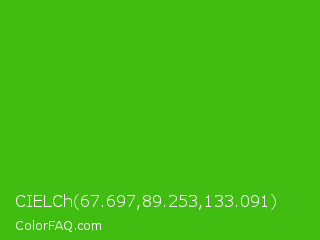 CIELCh 67.697,89.253,133.091 Color is a normal green color and the nearest color is Kelly Green #4cbb17. Hex code #41bd12 and RGB value is rgb(65,189,18). In RGB color space, this color is composed of 25% red, 74% green, 7% blue, In CMYK color space, this color is composed of 66% cyan, 0% magenta, 90% yellow , 26% black , In HSL color space, this color has a hue angle of 104° , 83% saturation and 41% lightness.