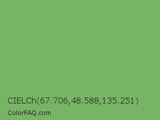 CIELCh 67.706,48.588,135.251 Color is a normal green color and the nearest color is Bud Green #7bb661. Hex code #78b465 and RGB value is rgb(120,180,101). In RGB color space, this color is composed of 47% red, 71% green, 40% blue, In CMYK color space, this color is composed of 33% cyan, 0% magenta, 44% yellow , 29% black , In HSL color space, this color has a hue angle of 106° , 34% saturation and 55% lightness.