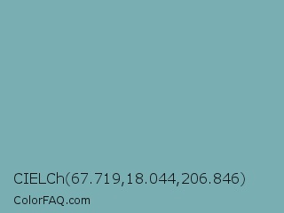 CIELCh 67.719,18.044,206.846 Color is a normal cyan color and the nearest color is Gulf Stream #80b3ae. Hex code #79aeb3 and RGB value is rgb(121,174,179). In RGB color space, this color is composed of 47% red, 68% green, 70% blue, In CMYK color space, this color is composed of 32% cyan, 3% magenta, 0% yellow , 30% black , In HSL color space, this color has a hue angle of 185° , 28% saturation and 59% lightness.