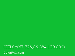 CIELCh 67.726,86.884,139.809 Color is a normal green color and the nearest color is Dark Pastel Green #03c03c. Hex code #0fbf33 and RGB value is rgb(15,191,51). In RGB color space, this color is composed of 6% red, 75% green, 20% blue, In CMYK color space, this color is composed of 92% cyan, 0% magenta, 73% yellow , 25% black , In HSL color space, this color has a hue angle of 132° , 85% saturation and 40% lightness.