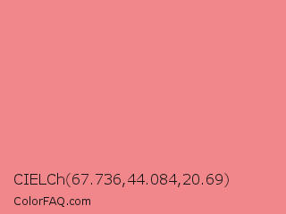 CIELCh 67.736,44.084,20.69 Color is a light red color and the nearest color is Geraldine #fb8989. Hex code #f1868b and RGB value is rgb(241,134,139). In RGB color space, this color is composed of 95% red, 53% green, 55% blue, In CMYK color space, this color is composed of 0% cyan, 44% magenta, 42% yellow , 5% black , In HSL color space, this color has a hue angle of 357° , 79% saturation and 74% lightness.
