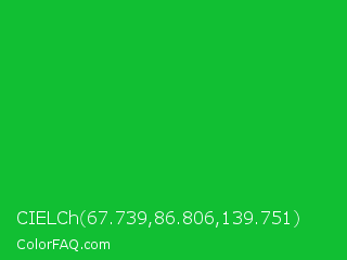 CIELCh 67.739,86.806,139.751 Color is a normal green color and the nearest color is Dark Pastel Green #03c03c. Hex code #11bf33 and RGB value is rgb(17,191,51). In RGB color space, this color is composed of 7% red, 75% green, 20% blue, In CMYK color space, this color is composed of 91% cyan, 0% magenta, 73% yellow , 25% black , In HSL color space, this color has a hue angle of 132° , 84% saturation and 41% lightness.