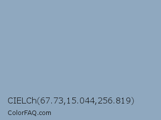 CIELCh 67.73,15.044,256.819 Color is a light blue color and the nearest color is Nepal #8eabc1. Hex code #8fa8bf and RGB value is rgb(143,168,191). In RGB color space, this color is composed of 56% red, 66% green, 75% blue, In CMYK color space, this color is composed of 25% cyan, 12% magenta, 0% yellow , 25% black , In HSL color space, this color has a hue angle of 209° , 27% saturation and 65% lightness.