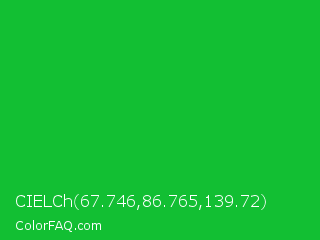 CIELCh 67.746,86.765,139.72 Color is a normal green color and the nearest color is Dark Pastel Green #03c03c. Hex code #12bf33 and RGB value is rgb(18,191,51). In RGB color space, this color is composed of 7% red, 75% green, 20% blue, In CMYK color space, this color is composed of 91% cyan, 0% magenta, 73% yellow , 25% black , In HSL color space, this color has a hue angle of 131° , 83% saturation and 41% lightness.