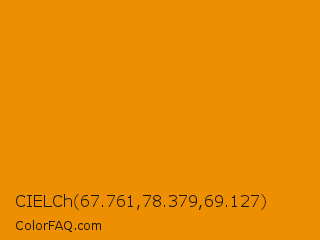 CIELCh 67.761,78.379,69.127 Color is a normal orange color and the nearest color is Tangerine #f28500. Hex code #ed8f00 and RGB value is rgb(237,143,0). In RGB color space, this color is composed of 93% red, 56% green, 0% blue, In CMYK color space, this color is composed of 0% cyan, 40% magenta, 100% yellow , 7% black , In HSL color space, this color has a hue angle of 36° , 100% saturation and 46% lightness.