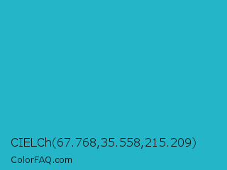 CIELCh 67.768,35.558,215.209 Color is a normal cyan color and the nearest color is Ball Blue #21abcd. Hex code #25b5c9 and RGB value is rgb(37,181,201). In RGB color space, this color is composed of 15% red, 71% green, 79% blue, In CMYK color space, this color is composed of 82% cyan, 10% magenta, 0% yellow , 21% black , In HSL color space, this color has a hue angle of 187° , 69% saturation and 47% lightness.