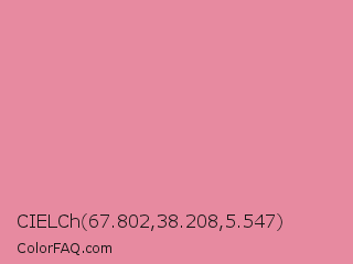 CIELCh 67.802,38.208,5.547 Color is a light red color and the nearest color is Carissma #ea88a8. Hex code #e78aa0 and RGB value is rgb(231,138,160). In RGB color space, this color is composed of 91% red, 54% green, 63% blue, In CMYK color space, this color is composed of 0% cyan, 40% magenta, 31% yellow , 9% black , In HSL color space, this color has a hue angle of 346° , 66% saturation and 72% lightness.