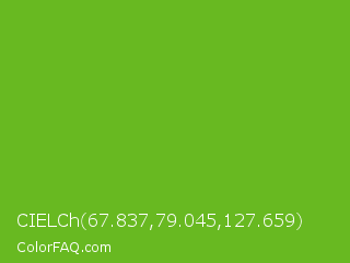 CIELCh 67.837,79.045,127.659 Color is a normal green color and the nearest color is Lima #76bd17. Hex code #68b921 and RGB value is rgb(104,185,33). In RGB color space, this color is composed of 41% red, 73% green, 13% blue, In CMYK color space, this color is composed of 44% cyan, 0% magenta, 82% yellow , 27% black , In HSL color space, this color has a hue angle of 92° , 70% saturation and 43% lightness.