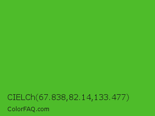 CIELCh 67.838,82.14,133.477 Color is a normal green color and the nearest color is Kelly Green #4cbb17. Hex code #4ebc2a and RGB value is rgb(78,188,42). In RGB color space, this color is composed of 31% red, 74% green, 16% blue, In CMYK color space, this color is composed of 59% cyan, 0% magenta, 78% yellow , 26% black , In HSL color space, this color has a hue angle of 105° , 63% saturation and 45% lightness.