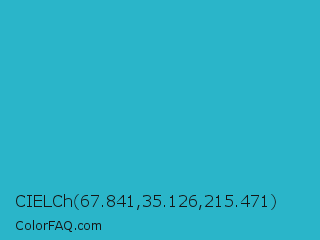 CIELCh 67.841,35.126,215.471 Color is a normal cyan color and the nearest color is Ball Blue #21abcd. Hex code #2ab5c9 and RGB value is rgb(42,181,201). In RGB color space, this color is composed of 16% red, 71% green, 79% blue, In CMYK color space, this color is composed of 79% cyan, 10% magenta, 0% yellow , 21% black , In HSL color space, this color has a hue angle of 188° , 65% saturation and 48% lightness.
