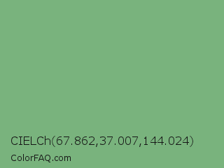CIELCh 67.862,37.007,144.024 Color is a normal green color and the nearest color is Iguana Green #71bc78. Hex code #79b37d and RGB value is rgb(121,179,125). In RGB color space, this color is composed of 47% red, 70% green, 49% blue, In CMYK color space, this color is composed of 32% cyan, 0% magenta, 30% yellow , 30% black , In HSL color space, this color has a hue angle of 124° , 28% saturation and 59% lightness.