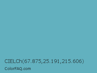 CIELCh 67.875,25.191,215.606 Color is a normal cyan color and the nearest color is Fountain Blue #56b4be. Hex code #62b1bf and RGB value is rgb(98,177,191). In RGB color space, this color is composed of 38% red, 69% green, 75% blue, In CMYK color space, this color is composed of 49% cyan, 7% magenta, 0% yellow , 25% black , In HSL color space, this color has a hue angle of 189° , 42% saturation and 57% lightness.