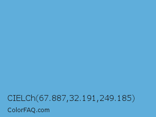 CIELCh 67.887,32.191,249.185 Color is a light blue color and the nearest color is Blue Jeans #5dadec. Hex code #5faedb and RGB value is rgb(95,174,219). In RGB color space, this color is composed of 37% red, 68% green, 86% blue, In CMYK color space, this color is composed of 57% cyan, 21% magenta, 0% yellow , 14% black , In HSL color space, this color has a hue angle of 202° , 63% saturation and 62% lightness.