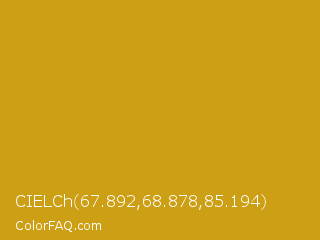 CIELCh 67.892,68.878,85.194 Color is a normal orange color and the nearest color is Lemon Curry #cca01d. Hex code #cd9f14 and RGB value is rgb(205,159,20). In RGB color space, this color is composed of 80% red, 62% green, 8% blue, In CMYK color space, this color is composed of 0% cyan, 22% magenta, 90% yellow , 20% black , In HSL color space, this color has a hue angle of 45° , 82% saturation and 44% lightness.