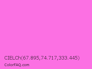 CIELCh 67.895,74.717,333.445 Color is a light magenta color and the nearest color is Pale Magenta #f984e5. Hex code #fc70e3 and RGB value is rgb(252,112,227). In RGB color space, this color is composed of 99% red, 44% green, 89% blue, In CMYK color space, this color is composed of 0% cyan, 56% magenta, 10% yellow , 1% black , In HSL color space, this color has a hue angle of 311° , 96% saturation and 71% lightness.