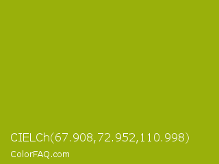 CIELCh 67.908,72.952,110.998 Color is a normal yellow color and the nearest color is Apple Green #8db600. Hex code #99b00b and RGB value is rgb(153,176,11). In RGB color space, this color is composed of 60% red, 69% green, 4% blue, In CMYK color space, this color is composed of 13% cyan, 0% magenta, 94% yellow , 31% black , In HSL color space, this color has a hue angle of 68° , 88% saturation and 37% lightness.