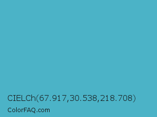 CIELCh 67.917,30.538,218.708 Color is a normal cyan color and the nearest color is Maximum Blue #47abcc. Hex code #4bb3c7 and RGB value is rgb(75,179,199). In RGB color space, this color is composed of 29% red, 70% green, 78% blue, In CMYK color space, this color is composed of 62% cyan, 10% magenta, 0% yellow , 22% black , In HSL color space, this color has a hue angle of 190° , 53% saturation and 54% lightness.