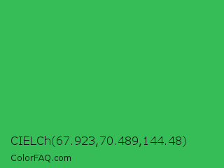 CIELCh 67.923,70.489,144.48 Color is a normal green color and the nearest color is Chateau Green #40a860. Hex code #36bd57 and RGB value is rgb(54,189,87). In RGB color space, this color is composed of 21% red, 74% green, 34% blue, In CMYK color space, this color is composed of 71% cyan, 0% magenta, 54% yellow , 26% black , In HSL color space, this color has a hue angle of 135° , 56% saturation and 48% lightness.