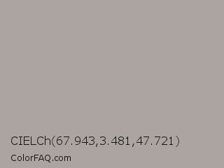CIELCh 67.943,3.481,47.721 Color is a light orange color and the nearest color is Cloudy #aca59f. Hex code #aca4a1 and RGB value is rgb(172,164,161). In RGB color space, this color is composed of 67% red, 64% green, 63% blue, In CMYK color space, this color is composed of 0% cyan, 5% magenta, 6% yellow , 33% black , In HSL color space, this color has a hue angle of 16° , 6% saturation and 65% lightness.
