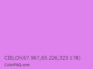 CIELCh 67.967,65.226,323.178 Color is a light magenta color and the nearest color is Lavender Magenta #ee82ee. Hex code #e082ed and RGB value is rgb(224,130,237). In RGB color space, this color is composed of 88% red, 51% green, 93% blue, In CMYK color space, this color is composed of 5% cyan, 45% magenta, 0% yellow , 7% black , In HSL color space, this color has a hue angle of 293° , 75% saturation and 72% lightness.