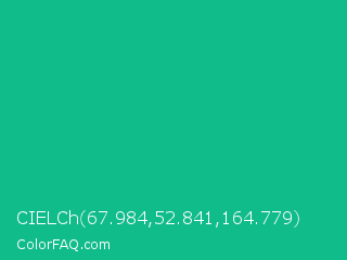 CIELCh 67.984,52.841,164.779 Color is a normal green color and the nearest color is Mountain Meadow Crayola #1ab385. Hex code #11bc8b and RGB value is rgb(17,188,139). In RGB color space, this color is composed of 7% red, 74% green, 55% blue, In CMYK color space, this color is composed of 91% cyan, 0% magenta, 26% yellow , 26% black , In HSL color space, this color has a hue angle of 163° , 83% saturation and 40% lightness.