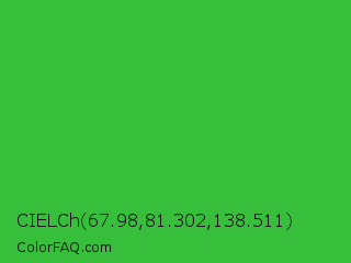 CIELCh 67.98,81.302,138.511 Color is a normal green color and the nearest color is Wageningen Green #34b233. Hex code #37be3a and RGB value is rgb(55,190,58). In RGB color space, this color is composed of 22% red, 75% green, 23% blue, In CMYK color space, this color is composed of 71% cyan, 0% magenta, 69% yellow , 25% black , In HSL color space, this color has a hue angle of 121° , 55% saturation and 48% lightness.