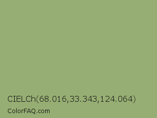 CIELCh 68.016,33.343,124.064 Color is a normal green color and the nearest color is Olivine #9ab973. Hex code #96ae73 and RGB value is rgb(150,174,115). In RGB color space, this color is composed of 59% red, 68% green, 45% blue, In CMYK color space, this color is composed of 14% cyan, 0% magenta, 34% yellow , 32% black , In HSL color space, this color has a hue angle of 84° , 27% saturation and 57% lightness.