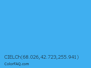 CIELCh 68.026,42.723,255.941 Color is a normal blue color and the nearest color is Picton Blue #45b1e8. Hex code #3faff0 and RGB value is rgb(63,175,240). In RGB color space, this color is composed of 25% red, 69% green, 94% blue, In CMYK color space, this color is composed of 74% cyan, 27% magenta, 0% yellow , 6% black , In HSL color space, this color has a hue angle of 202° , 86% saturation and 59% lightness.