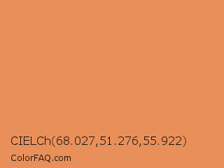CIELCh 68.027,51.276,55.922 Color is a light orange color and the nearest color is Big Foot Feet #e88e5a. Hex code #e9905a and RGB value is rgb(233,144,90). In RGB color space, this color is composed of 91% red, 56% green, 35% blue, In CMYK color space, this color is composed of 0% cyan, 38% magenta, 61% yellow , 9% black , In HSL color space, this color has a hue angle of 23° , 76% saturation and 63% lightness.