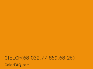CIELCh 68.032,77.859,68.26 Color is a normal orange color and the nearest color is Tangerine #f28500. Hex code #ef8f09 and RGB value is rgb(239,143,9). In RGB color space, this color is composed of 94% red, 56% green, 4% blue, In CMYK color space, this color is composed of 0% cyan, 40% magenta, 96% yellow , 6% black , In HSL color space, this color has a hue angle of 35° , 93% saturation and 49% lightness.