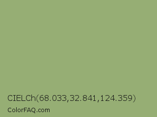 CIELCh 68.033,32.841,124.359 Color is a normal green color and the nearest color is Olivine #9ab973. Hex code #96ae74 and RGB value is rgb(150,174,116). In RGB color space, this color is composed of 59% red, 68% green, 45% blue, In CMYK color space, this color is composed of 14% cyan, 0% magenta, 33% yellow , 32% black , In HSL color space, this color has a hue angle of 85° , 26% saturation and 57% lightness.