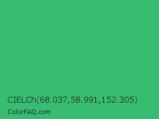 CIELCh 68.037,58.991,152.305 Color is a normal green color and the nearest color is Medium Sea Green #3cb371. Hex code #38bc72 and RGB value is rgb(56,188,114). In RGB color space, this color is composed of 22% red, 74% green, 45% blue, In CMYK color space, this color is composed of 70% cyan, 0% magenta, 39% yellow , 26% black , In HSL color space, this color has a hue angle of 146° , 54% saturation and 48% lightness.