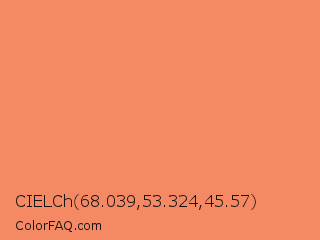 CIELCh 68.039,53.324,45.57 Color is a light orange color and the nearest color is Salmon #ff8c69. Hex code #f48963 and RGB value is rgb(244,137,99). In RGB color space, this color is composed of 96% red, 54% green, 39% blue, In CMYK color space, this color is composed of 0% cyan, 44% magenta, 59% yellow , 4% black , In HSL color space, this color has a hue angle of 16° , 87% saturation and 67% lightness.