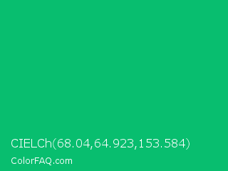 CIELCh 68.04,64.923,153.584 Color is a normal green color and the nearest color is GO Green #00ab66. Hex code #08be6f and RGB value is rgb(8,190,111). In RGB color space, this color is composed of 3% red, 75% green, 44% blue, In CMYK color space, this color is composed of 96% cyan, 0% magenta, 42% yellow , 25% black , In HSL color space, this color has a hue angle of 154° , 92% saturation and 39% lightness.