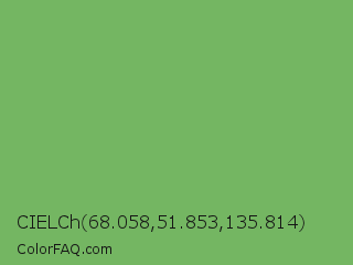 CIELCh 68.058,51.853,135.814 Color is a normal green color and the nearest color is Bud Green #7bb661. Hex code #74b662 and RGB value is rgb(116,182,98). In RGB color space, this color is composed of 45% red, 71% green, 38% blue, In CMYK color space, this color is composed of 36% cyan, 0% magenta, 46% yellow , 29% black , In HSL color space, this color has a hue angle of 107° , 37% saturation and 55% lightness.