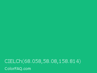 CIELCh 68.058,58.08,158.814 Color is a normal green color and the nearest color is Mountain Meadow Crayola #1ab385. Hex code #14bd7e and RGB value is rgb(20,189,126). In RGB color space, this color is composed of 8% red, 74% green, 49% blue, In CMYK color space, this color is composed of 89% cyan, 0% magenta, 33% yellow , 26% black , In HSL color space, this color has a hue angle of 158° , 81% saturation and 41% lightness.