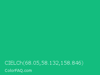 CIELCh 68.05,58.132,158.846 Color is a normal green color and the nearest color is Mountain Meadow Crayola #1ab385. Hex code #13bd7e and RGB value is rgb(19,189,126). In RGB color space, this color is composed of 7% red, 74% green, 49% blue, In CMYK color space, this color is composed of 90% cyan, 0% magenta, 33% yellow , 26% black , In HSL color space, this color has a hue angle of 158° , 82% saturation and 41% lightness.