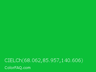 CIELCh 68.062,85.957,140.606 Color is a normal green color and the nearest color is Dark Pastel Green #03c03c. Hex code #0bc038 and RGB value is rgb(11,192,56). In RGB color space, this color is composed of 4% red, 75% green, 22% blue, In CMYK color space, this color is composed of 94% cyan, 0% magenta, 71% yellow , 25% black , In HSL color space, this color has a hue angle of 135° , 89% saturation and 40% lightness.