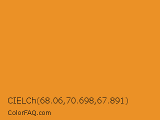 CIELCh 68.06,70.698,67.891 Color is a normal orange color and the nearest color is Carrot Orange #ed9121. Hex code #eb9126 and RGB value is rgb(235,145,38). In RGB color space, this color is composed of 92% red, 57% green, 15% blue, In CMYK color space, this color is composed of 0% cyan, 38% magenta, 84% yellow , 8% black , In HSL color space, this color has a hue angle of 33° , 83% saturation and 54% lightness.