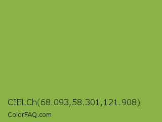 CIELCh 68.093,58.301,121.908 Color is a normal green color and the nearest color is Sushi #87ab39. Hex code #8ab347 and RGB value is rgb(138,179,71). In RGB color space, this color is composed of 54% red, 70% green, 28% blue, In CMYK color space, this color is composed of 23% cyan, 0% magenta, 60% yellow , 30% black , In HSL color space, this color has a hue angle of 83° , 43% saturation and 49% lightness.