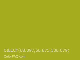 CIELCh 68.097,66.875,106.079 Color is a normal yellow color and the nearest color is Citron #9fa91f. Hex code #a6ad21 and RGB value is rgb(166,173,33). In RGB color space, this color is composed of 65% red, 68% green, 13% blue, In CMYK color space, this color is composed of 4% cyan, 0% magenta, 81% yellow , 32% black , In HSL color space, this color has a hue angle of 63° , 68% saturation and 40% lightness.