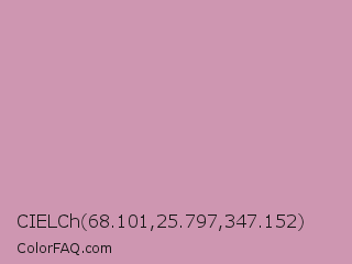 CIELCh 68.101,25.797,347.152 Color is a light rose color and the nearest color is Viola #cb8fa9. Hex code #ce96b1 and RGB value is rgb(206,150,177). In RGB color space, this color is composed of 81% red, 59% green, 69% blue, In CMYK color space, this color is composed of 0% cyan, 27% magenta, 14% yellow , 19% black , In HSL color space, this color has a hue angle of 331° , 36% saturation and 70% lightness.