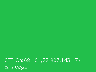 CIELCh 68.101,77.907,143.17 Color is a normal green color and the nearest color is Wageningen Green #34b233. Hex code #22bf4b and RGB value is rgb(34,191,75). In RGB color space, this color is composed of 13% red, 75% green, 29% blue, In CMYK color space, this color is composed of 82% cyan, 0% magenta, 61% yellow , 25% black , In HSL color space, this color has a hue angle of 136° , 70% saturation and 44% lightness.