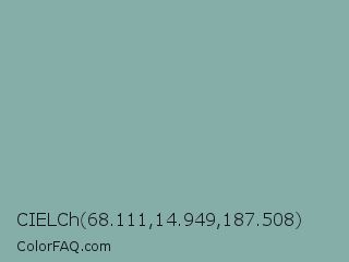 CIELCh 68.111,14.949,187.508 Color is a normal cyan color and the nearest color is Gulf Stream #80b3ae. Hex code #85aea9 and RGB value is rgb(133,174,169). In RGB color space, this color is composed of 52% red, 68% green, 66% blue, In CMYK color space, this color is composed of 24% cyan, 0% magenta, 3% yellow , 32% black , In HSL color space, this color has a hue angle of 173° , 20% saturation and 60% lightness.