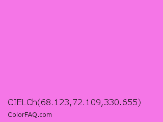 CIELCh 68.123,72.109,330.655 Color is a light magenta color and the nearest color is Pale Magenta #f984e5. Hex code #f576e7 and RGB value is rgb(245,118,231). In RGB color space, this color is composed of 96% red, 46% green, 91% blue, In CMYK color space, this color is composed of 0% cyan, 52% magenta, 6% yellow , 4% black , In HSL color space, this color has a hue angle of 307° , 86% saturation and 71% lightness.