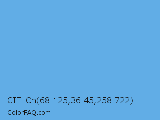 CIELCh 68.125,36.45,258.722 Color is a light blue color and the nearest color is Blue Jeans #5dadec. Hex code #61ade6 and RGB value is rgb(97,173,230). In RGB color space, this color is composed of 38% red, 68% green, 90% blue, In CMYK color space, this color is composed of 58% cyan, 25% magenta, 0% yellow , 10% black , In HSL color space, this color has a hue angle of 206° , 73% saturation and 64% lightness.