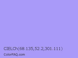 CIELCh 68.135,52.2,301.111 Color is a light indigo color and the nearest color is Biloba Flower #b2a1ea. Hex code #ab99f7 and RGB value is rgb(171,153,247). In RGB color space, this color is composed of 67% red, 60% green, 97% blue, In CMYK color space, this color is composed of 31% cyan, 38% magenta, 0% yellow , 3% black , In HSL color space, this color has a hue angle of 251° , 85% saturation and 78% lightness.